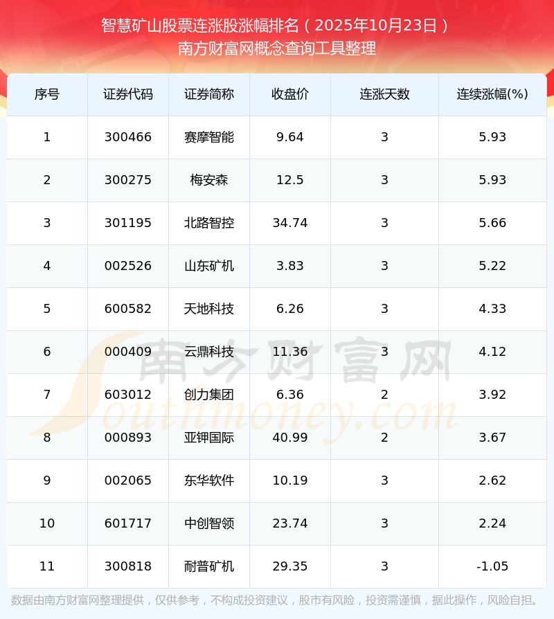 2025年10月23日智慧礦山股票連漲股漲幅排名
