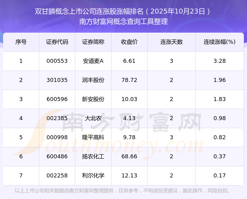 2025年10月23日雙甘膦概念上市公司連漲股票漲幅排名