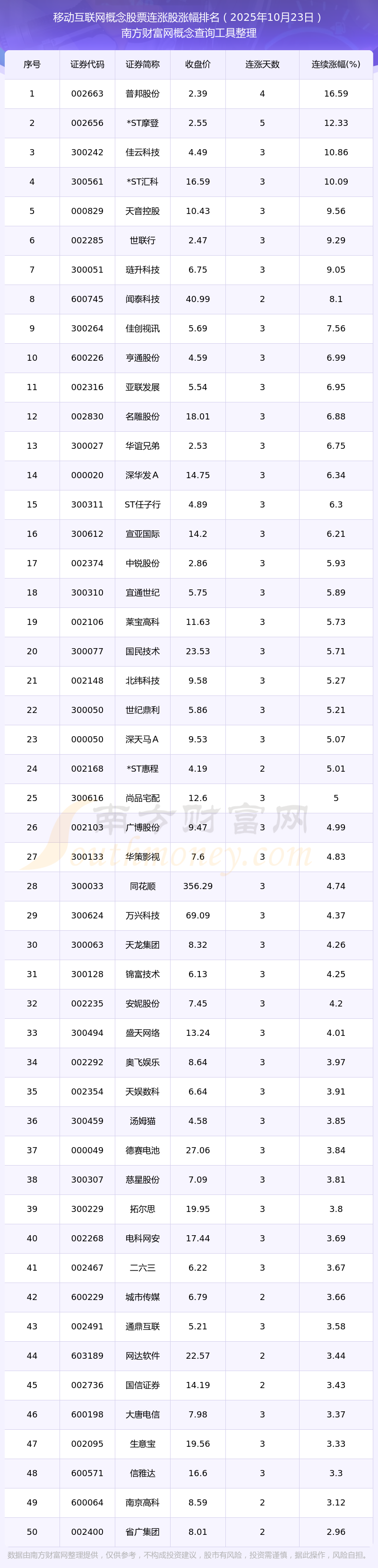 2025年10月23日移動(dòng)互聯(lián)網(wǎng)概念股票連漲股漲幅排名