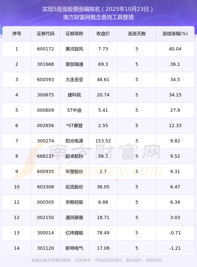 根據南方財富網概念查詢工具數據統(tǒng)計,截止2025年10月23日收盤,共有14只個股實現5天連漲。其中連續(xù)漲幅較大的個股有黃河旋風、昊創(chuàng)瑞通、大連圣亞等,連續(xù)漲幅分別為40.04%、36.10%、34.50%。