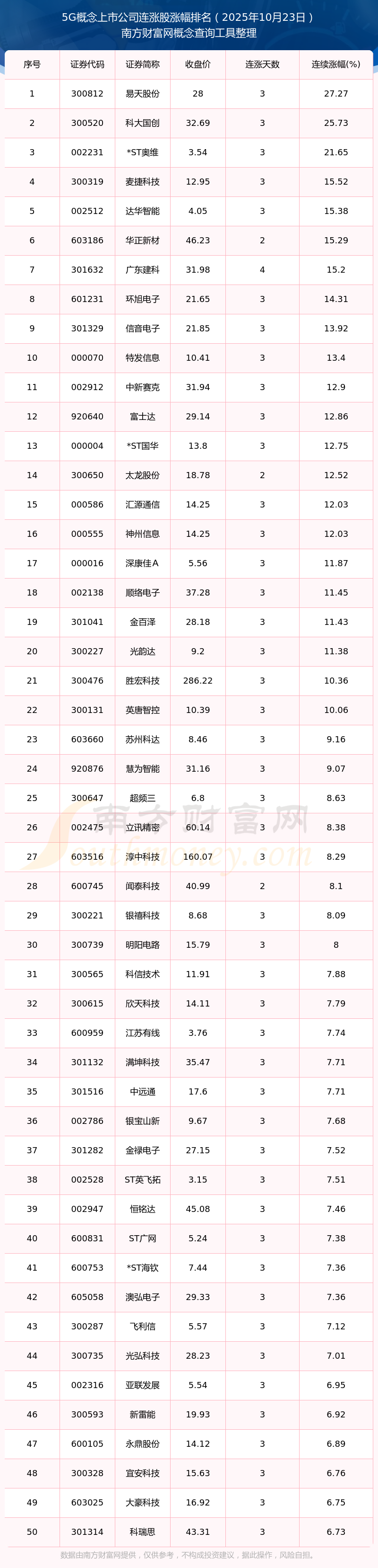2025年10月23日5G概念上市公司連漲股漲幅排名