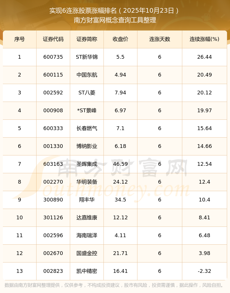 2025年10月23日實(shí)現(xiàn)6連漲股票漲幅排名