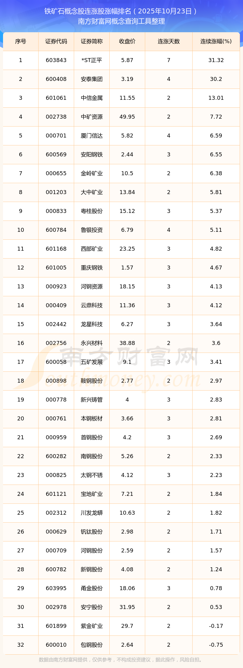 2025年10月23日鐵礦石概念股連漲股漲幅排名