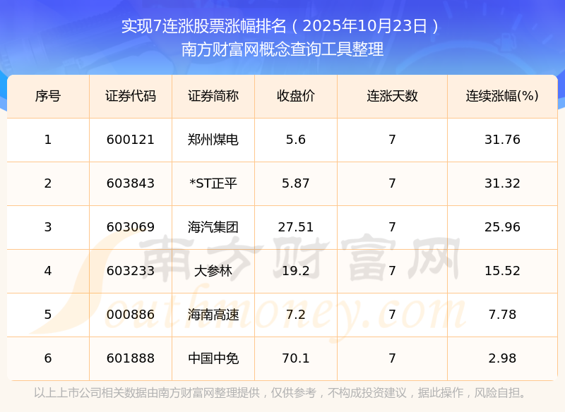 根據(jù)南方財富網(wǎng)概念查詢工具數(shù)據(jù)統(tǒng)計,截止2025年10月23日收盤,共有6只個股實現(xiàn)7天連漲。其中連續(xù)漲幅較大的個股有鄭州煤電、*ST正平、海汽集團等,連續(xù)漲幅分別為31.76%、31.32%、25.96%。