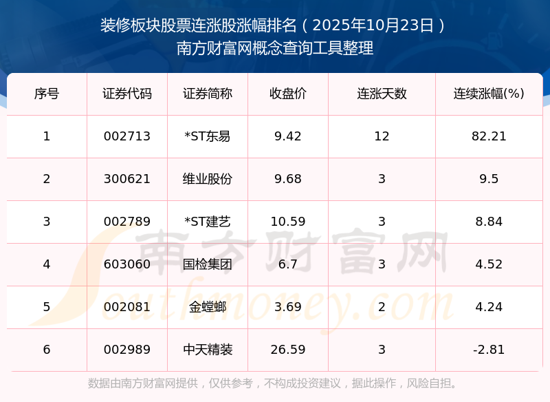 2025年10月23日裝修板塊股票連漲股漲幅排名