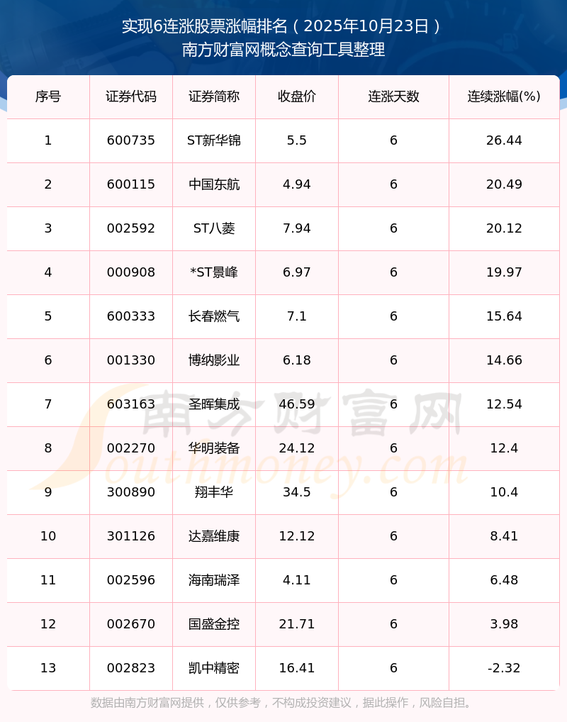 根據(jù)南方財富網(wǎng)概念查詢工具數(shù)據(jù)統(tǒng)計,截止2025年10月23日收盤,共有13只個股實現(xiàn)6天連漲。其中連續(xù)漲幅較大的個股有ST新華錦、中國東航、ST八菱等,連續(xù)漲幅分別為26.44%、20.49%、20.12%。
