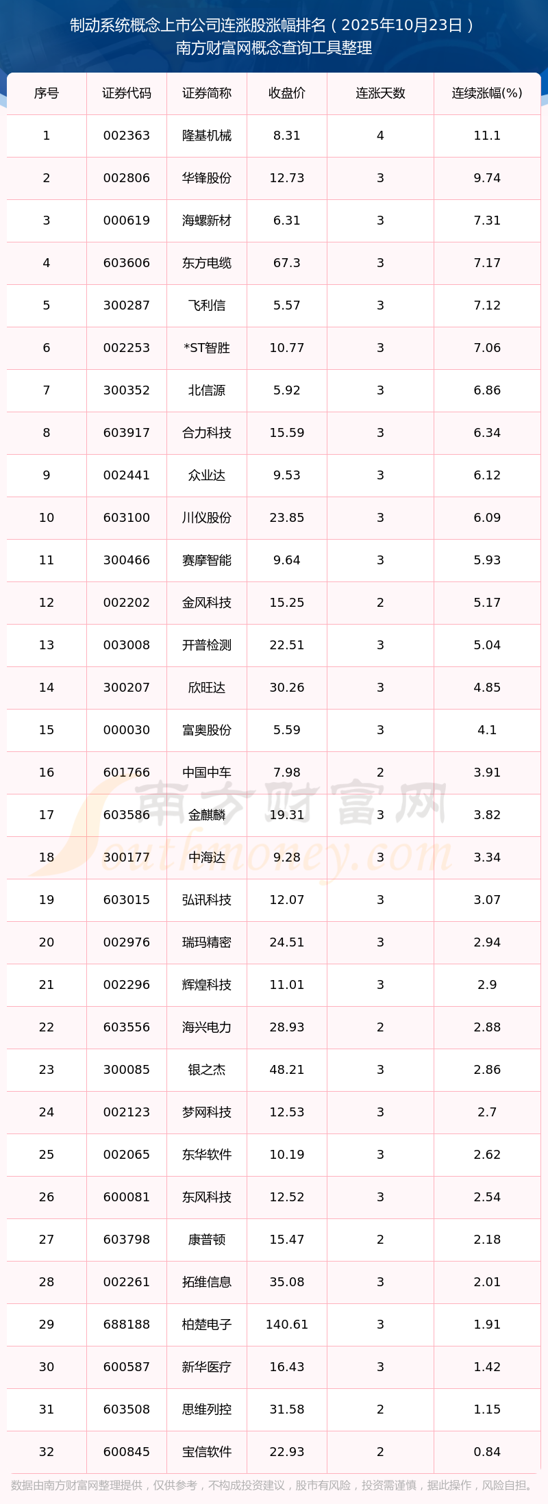 2025年10月23日制動系統(tǒng)概念上市公司連漲股漲幅排名