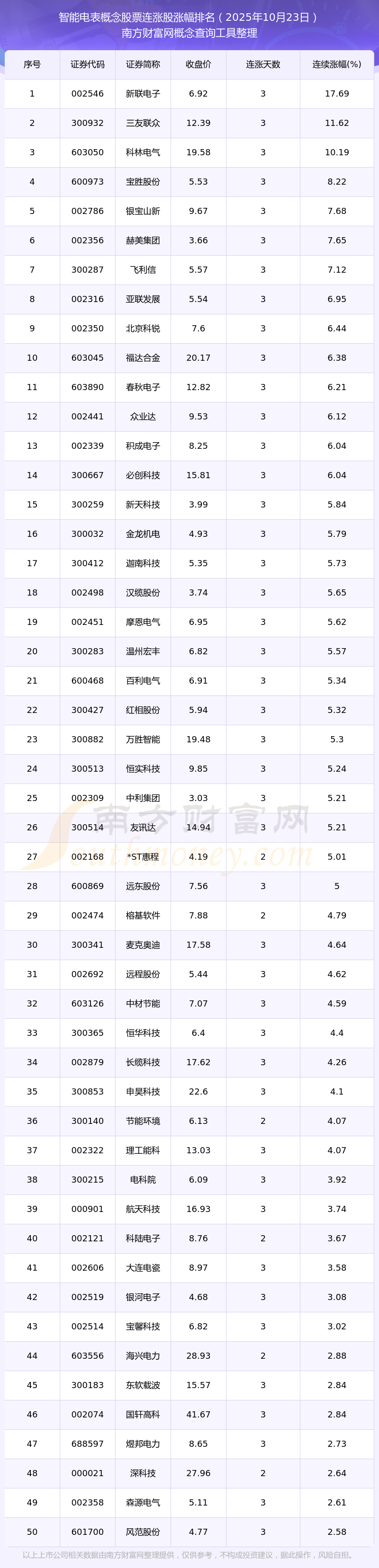 2025年10月23日智能電表概念股票連漲股票漲幅排名