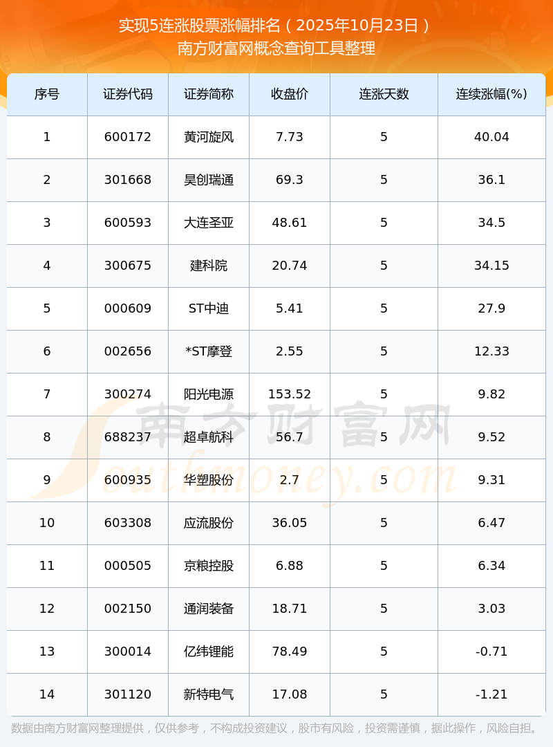 2025年10月23日實(shí)現(xiàn)5連漲股票漲幅排名