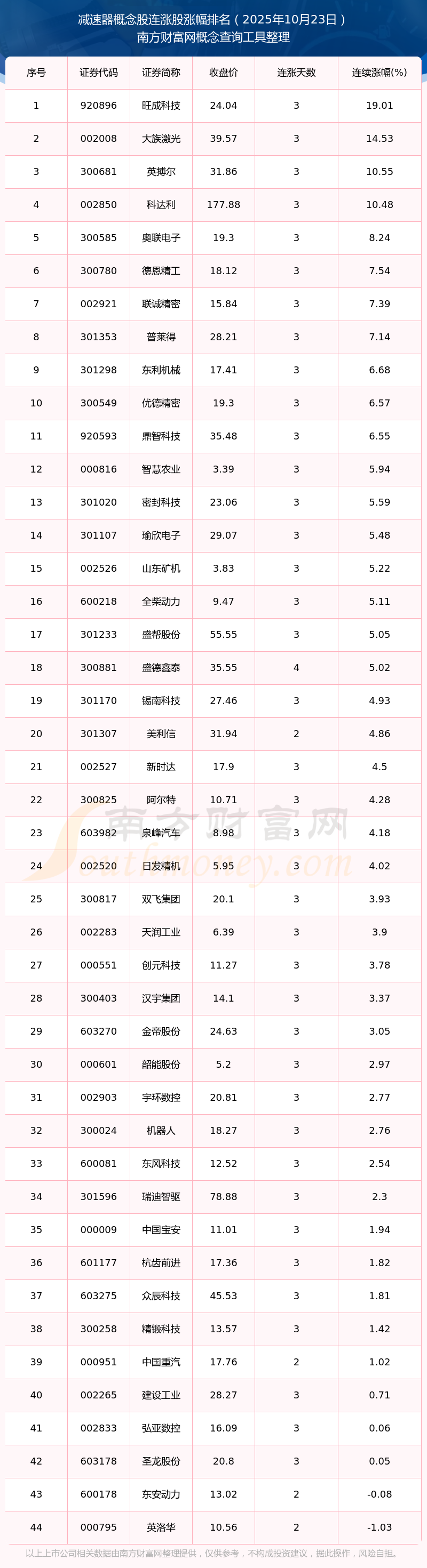 根據(jù)南方財(cái)富網(wǎng)概念查詢工具數(shù)據(jù)統(tǒng)計(jì),截止2025年10月23日收盤,減速器概念股共有44只個(gè)股實(shí)現(xiàn)連漲。其中連續(xù)漲幅較大的個(gè)股有旺成科技、大族激光、英搏爾等,連續(xù)漲幅分別為19.01%、14.53%、10.55%。