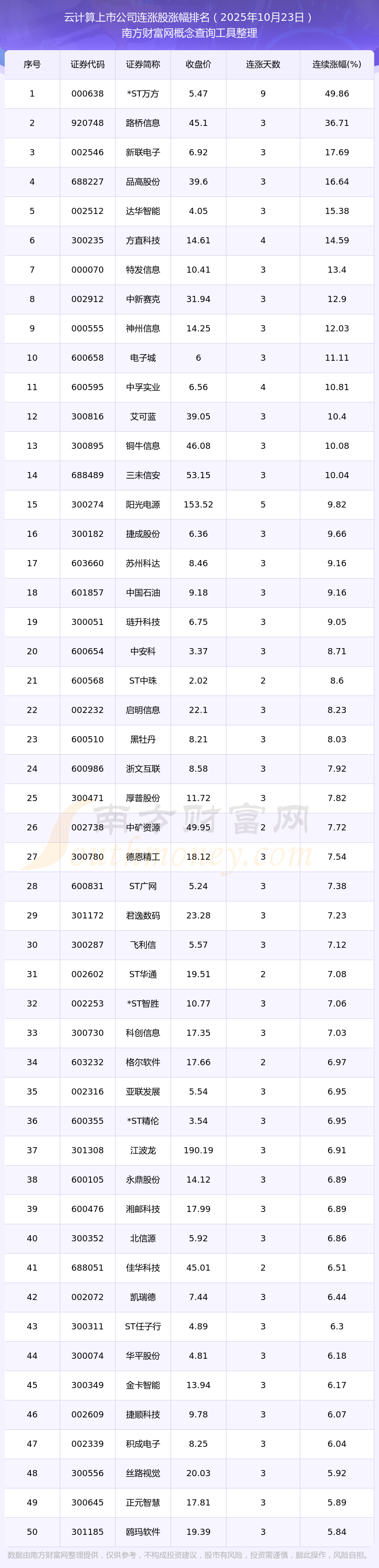 2025年10月23日云計算上市公司連漲股漲幅排名