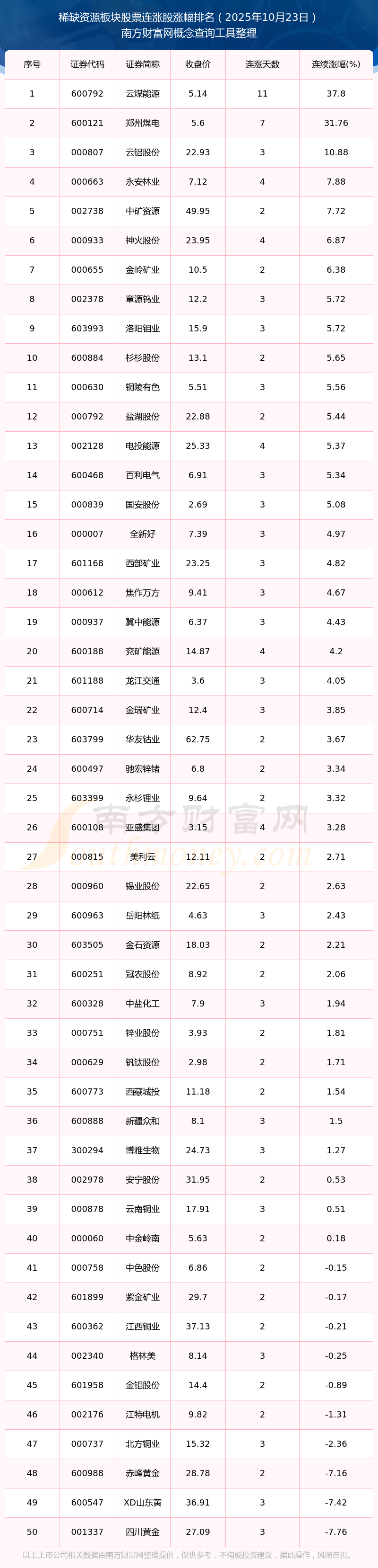 2025年10月23日稀缺資源板塊股票連漲股漲幅排名
