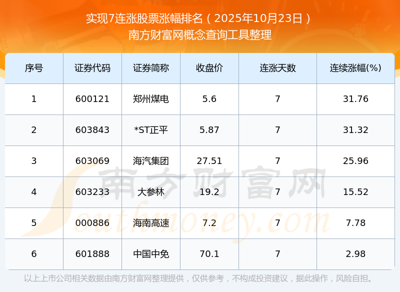 根據(jù)南方財(cái)富網(wǎng)概念查詢工具數(shù)據(jù)統(tǒng)計(jì),截止2025年10月23日收盤,共有6只個(gè)股實(shí)現(xiàn)7天連漲。其中連續(xù)漲幅較大的個(gè)股有鄭州煤電、*ST正平、海汽集團(tuán)等,連續(xù)漲幅分別為31.76%、31.32%、25.96%。