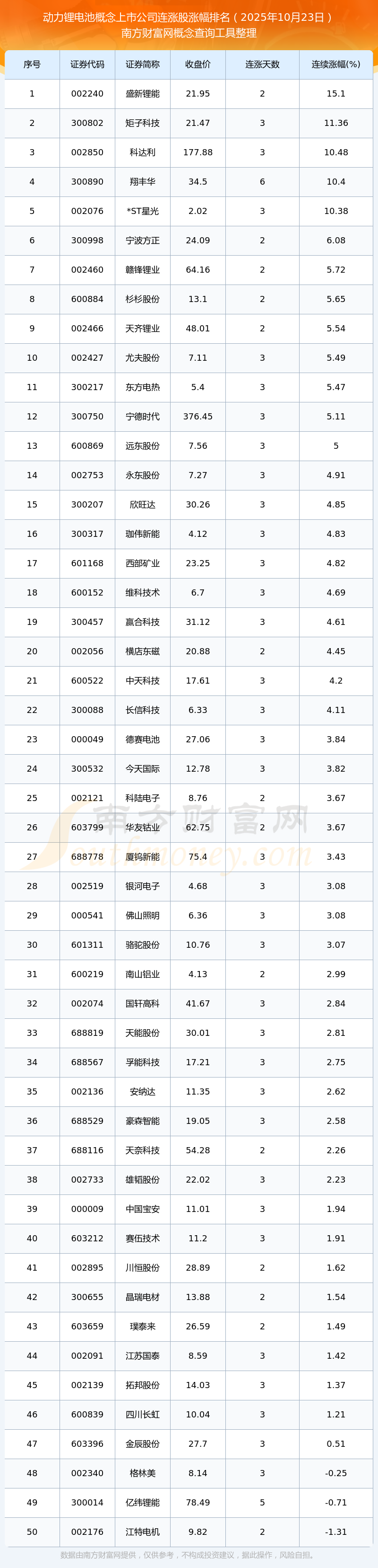 2025年10月23日動力鋰電池概念上市公司連漲股票漲幅排名