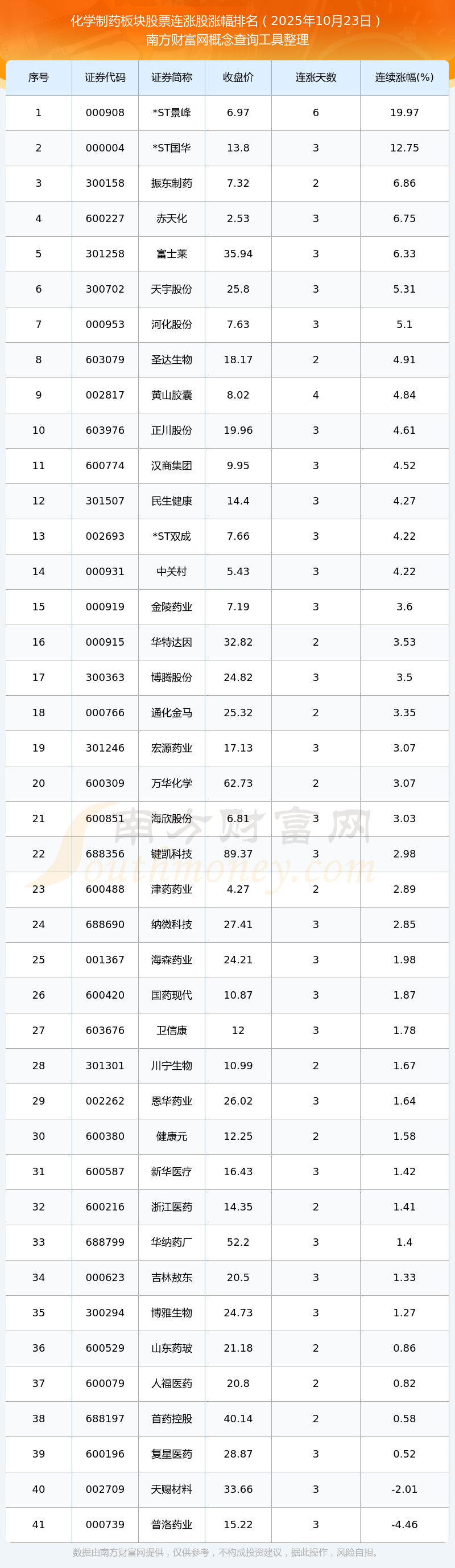 2025年10月23日化學(xué)制藥板塊股票連漲股漲幅排名