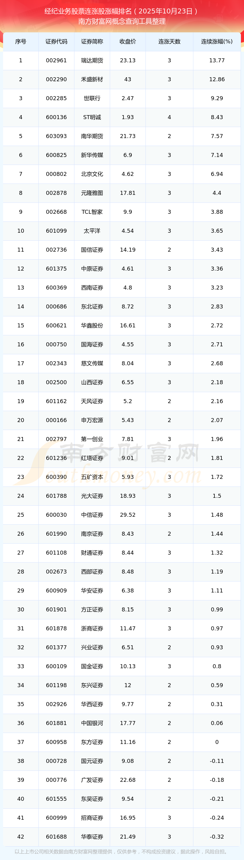 2025年10月23日經(jīng)紀(jì)業(yè)務(wù)股票連漲股漲幅排名