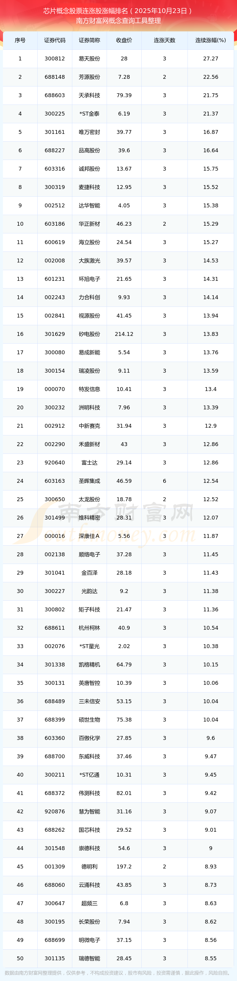 2025年10月23日芯片概念股票連漲股漲幅排名