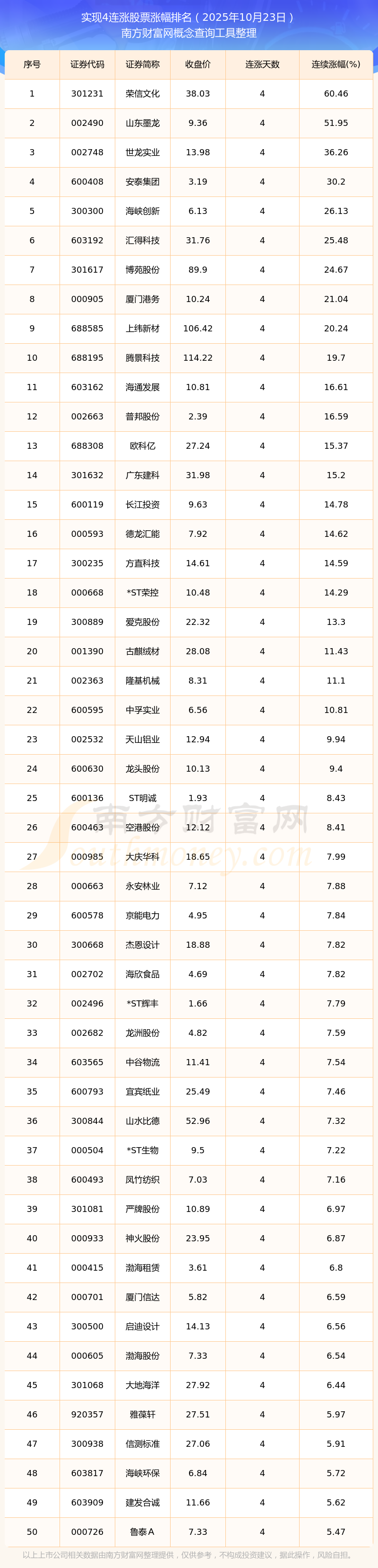 2025年10月23日實(shí)現(xiàn)4連漲股票漲幅排名