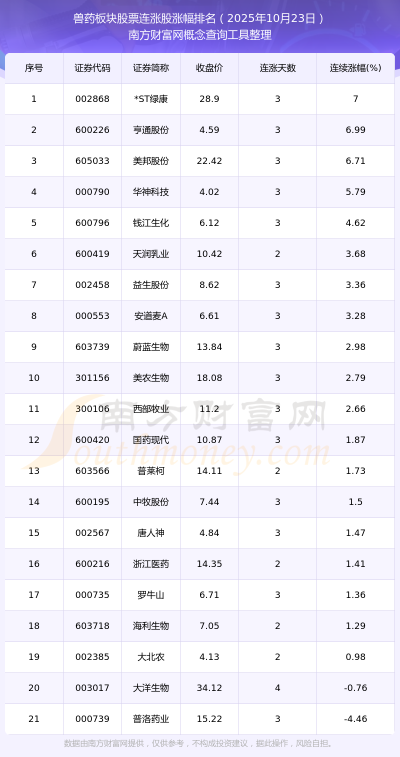 2025年10月23日獸藥板塊股票連漲股漲幅排名