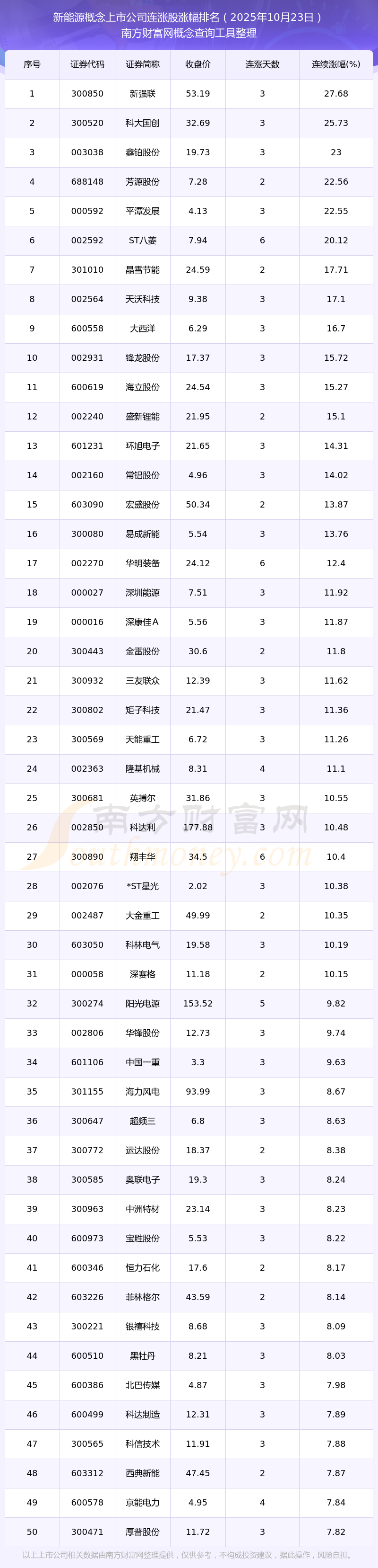 2025年10月23日新能源概念上市公司連漲股漲幅排名