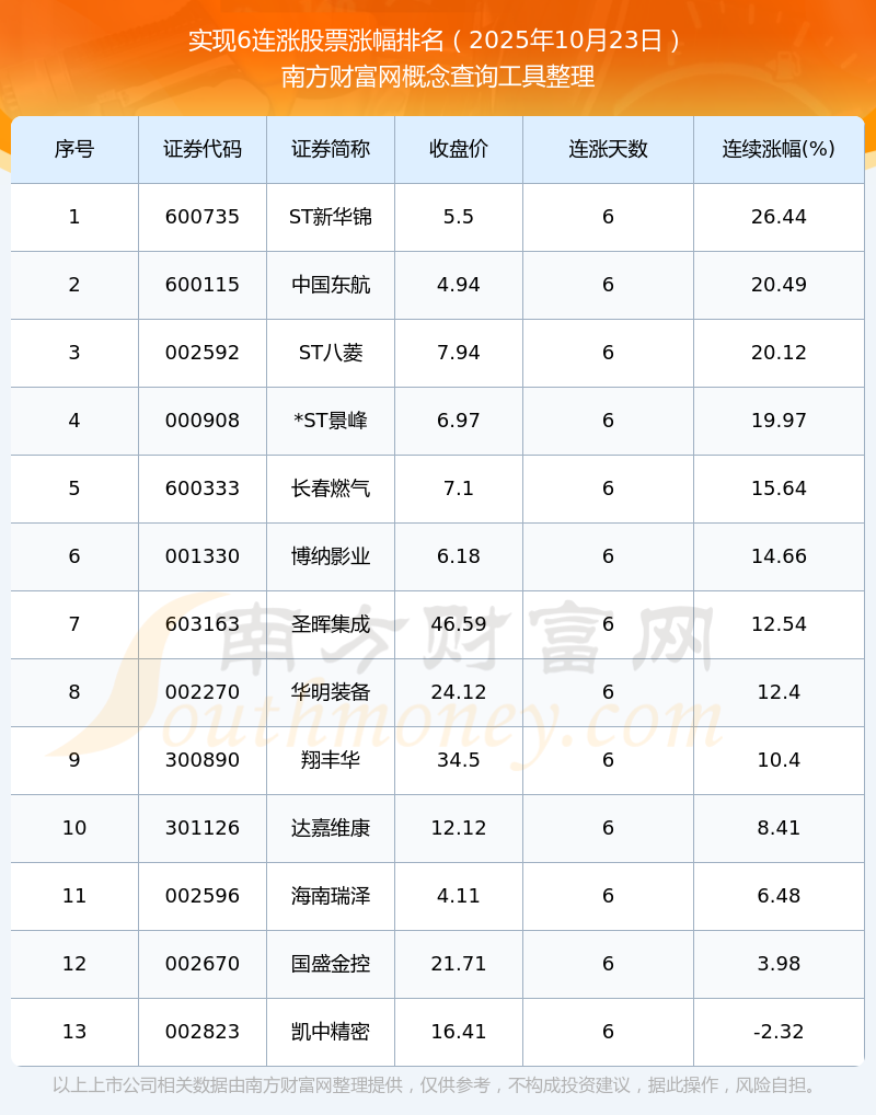 2025年10月23日實(shí)現(xiàn)6連漲股票漲幅排名