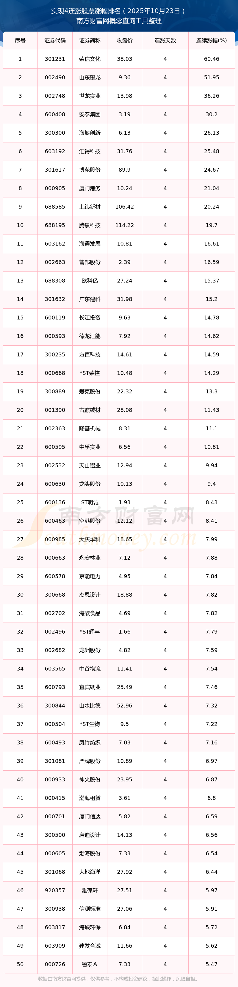 根據(jù)南方財富網(wǎng)概念查詢工具數(shù)據(jù)統(tǒng)計,截止2025年10月23日收盤,共有83只個股實現(xiàn)4天連漲。其中連續(xù)漲幅較大的個股有榮信文化、山東墨龍、世龍實業(yè)等,連續(xù)漲幅分別為60.46%、51.95%、36.26%。