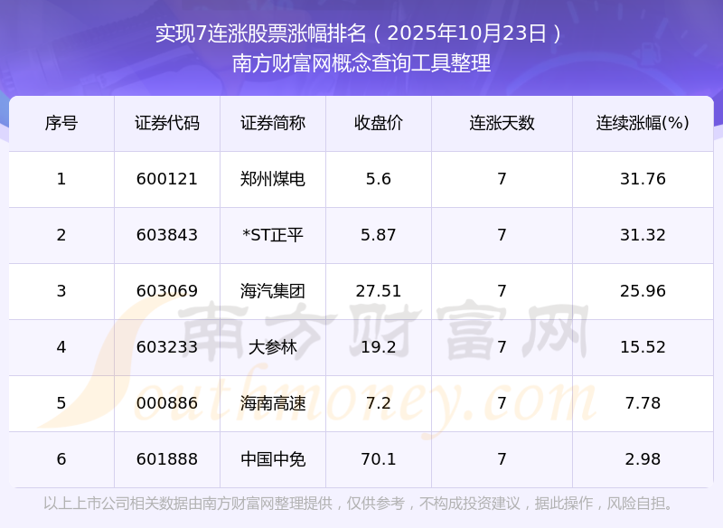 根據(jù)南方財(cái)富網(wǎng)概念查詢工具數(shù)據(jù)統(tǒng)計(jì),截止2025年10月23日收盤,共有6只個(gè)股實(shí)現(xiàn)7天連漲。其中連續(xù)漲幅較大的個(gè)股有鄭州煤電、*ST正平、海汽集團(tuán)等,連續(xù)漲幅分別為31.76%、31.32%、25.96%。