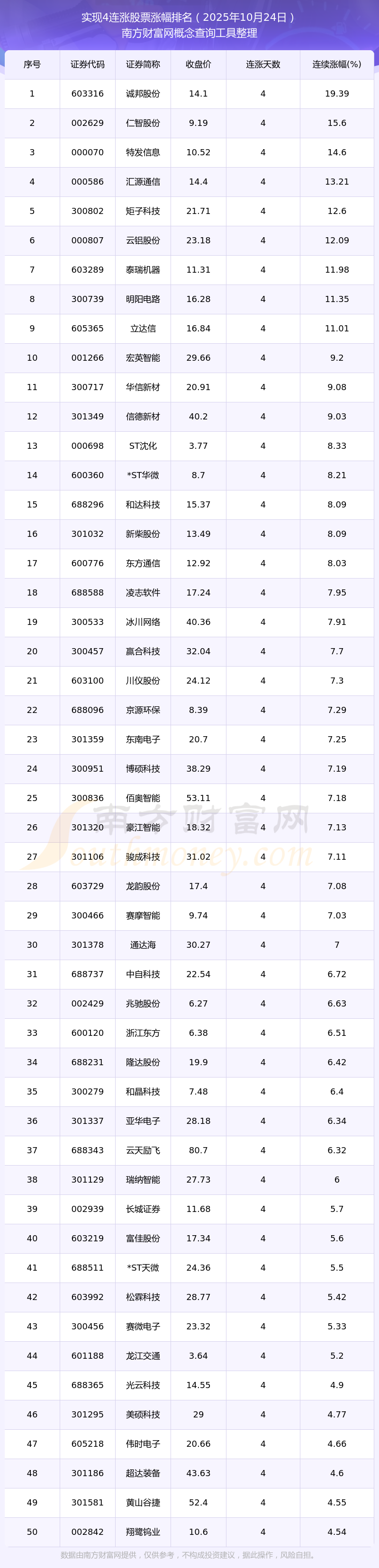 根據(jù)南方財富網(wǎng)概念查詢工具數(shù)據(jù)統(tǒng)計,截止2025年10月24日收盤,共有60只個股實現(xiàn)4天連漲。其中連續(xù)漲幅較大的個股有誠邦股份、仁智股份、特發(fā)信息等,連續(xù)漲幅分別為19.39%、15.60%、14.60%。