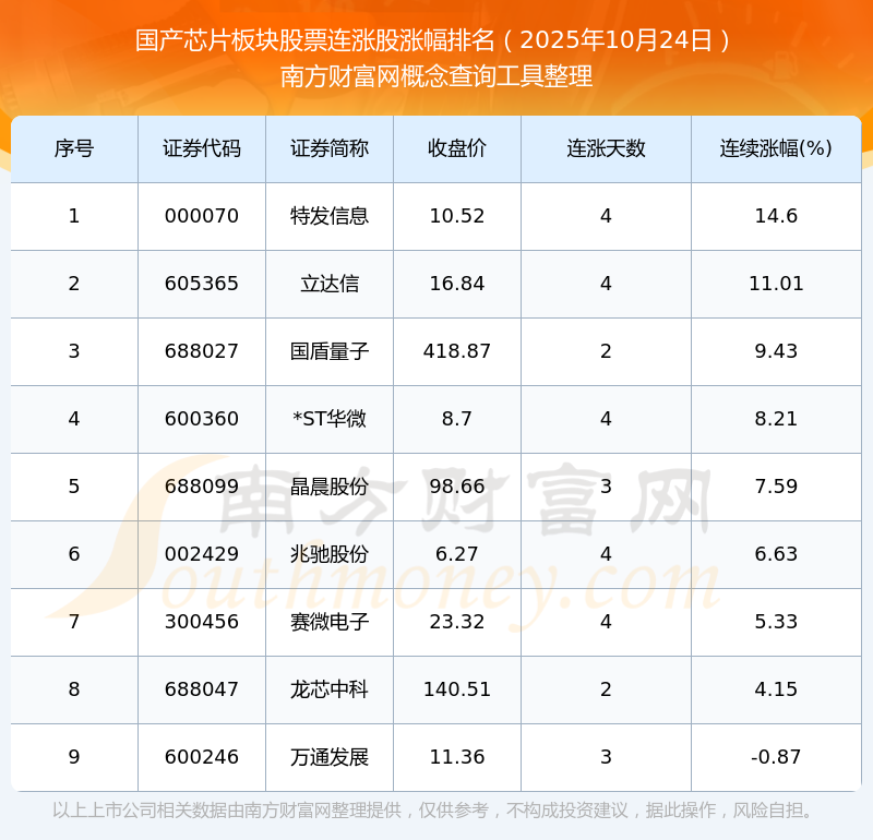 2025年10月24日國產(chǎn)芯片板塊股票連漲股漲幅排名