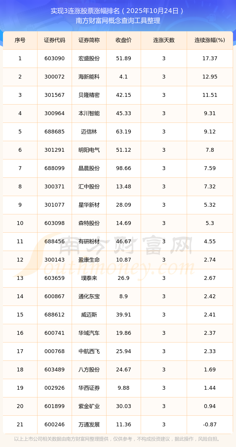 根據(jù)南方財富網(wǎng)概念查詢工具數(shù)據(jù)統(tǒng)計,截止2025年10月24日收盤,共有21只個股實現(xiàn)3天連漲。其中連續(xù)漲幅較大的個股有宏盛股份、海新能科、貝隆精密等,連續(xù)漲幅分別為17.37%、12.95%、11.51%。