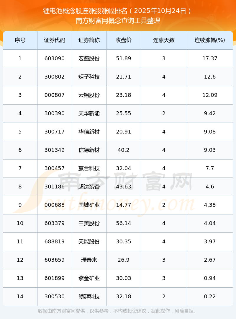 2025年10月24日鋰電池概念股連漲股漲幅排名