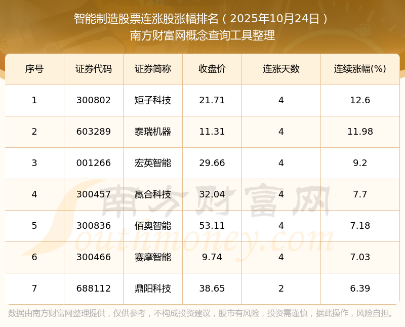根據(jù)南方財富網(wǎng)概念查詢工具數(shù)據(jù)統(tǒng)計,截止2025年10月24日收盤,智能制造股票共有7只個股實現(xiàn)連漲。其中連續(xù)漲幅較大的個股有矩子科技、泰瑞機(jī)器、宏英智能等,連續(xù)漲幅分別為12.60%、11.98%、9.20%。