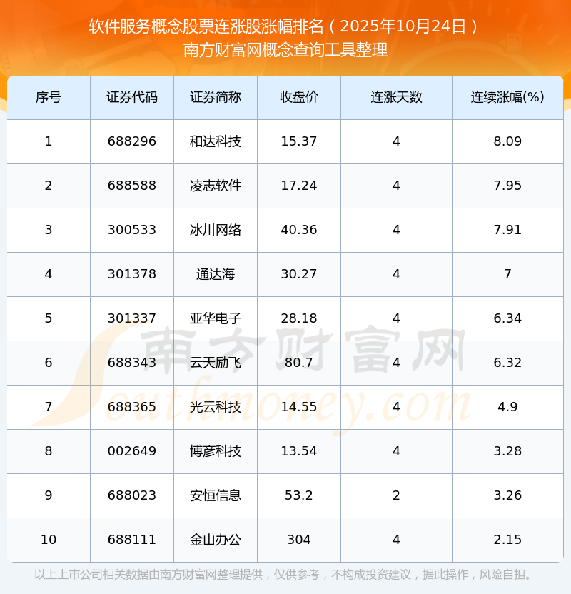 2025年10月24日軟件服務(wù)概念股票連漲股漲幅排名