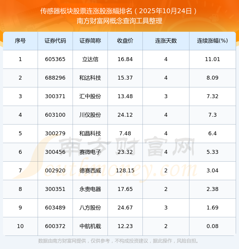 2025年10月24日傳感器板塊股票連漲股漲幅排名