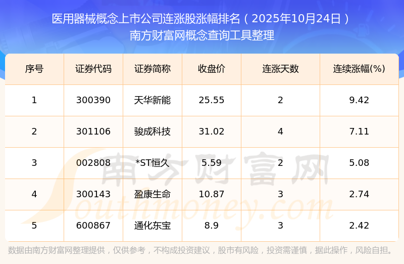 2025年10月24日醫(yī)用器械概念上市公司連漲股漲幅排名