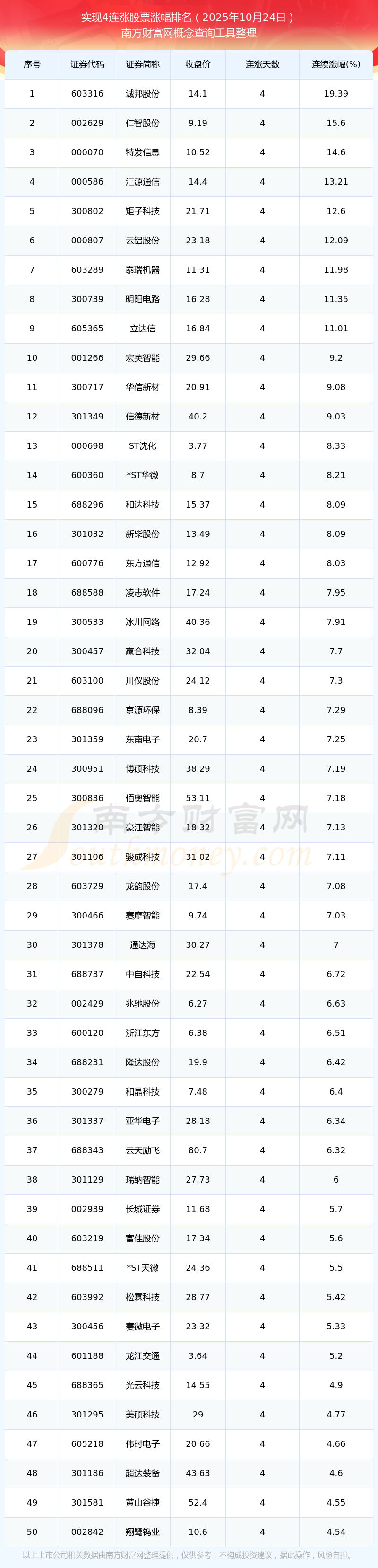 根據(jù)南方財(cái)富網(wǎng)概念查詢工具數(shù)據(jù)統(tǒng)計(jì),截止2025年10月24日收盤,共有60只個(gè)股實(shí)現(xiàn)4天連漲。其中連續(xù)漲幅較大的個(gè)股有誠(chéng)邦股份、仁智股份、特發(fā)信息等,連續(xù)漲幅分別為19.39%、15.60%、14.60%。