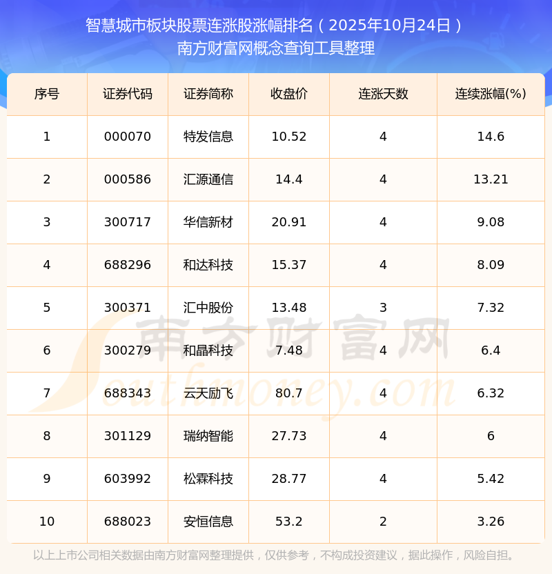 根據南方財富網概念查詢工具數據統(tǒng)計,截止2025年10月24日收盤,智慧城市板塊股票共有10只個股實現連漲。其中連續(xù)漲幅較大的個股有特發(fā)信息、匯源通信、華信新材等,連續(xù)漲幅分別為14.60%、13.21%、9.08%。