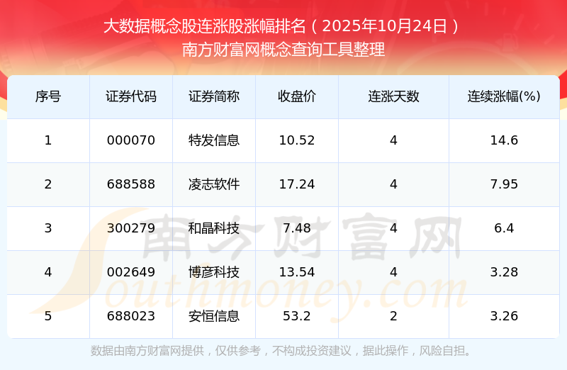 2025年10月24日大數(shù)據(jù)概念股連漲股漲幅排名