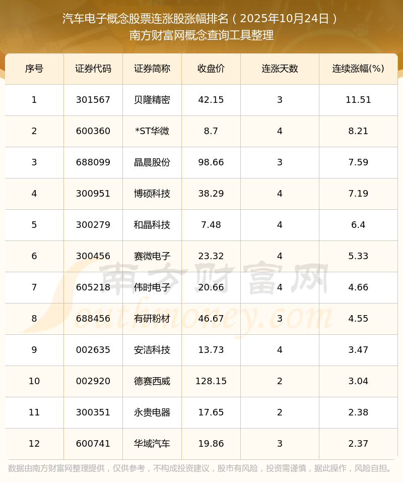 2025年10月24日汽車電子概念股票連漲股漲幅排名