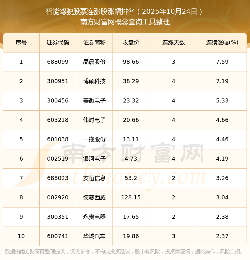 根據(jù)南方財富網(wǎng)概念查詢工具數(shù)據(jù)統(tǒng)計,截止2025年10月24日收盤,智能駕駛股票共有10只個股實(shí)現(xiàn)連漲。其中連續(xù)漲幅較大的個股有晶晨股份、博碩科技、賽微電子等,連續(xù)漲幅分別為7.59%、7.19%、5.33%。
