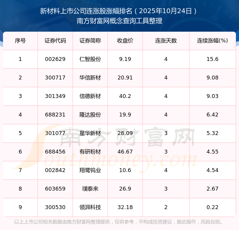 2025年10月24日新材料上市公司連漲股漲幅排名