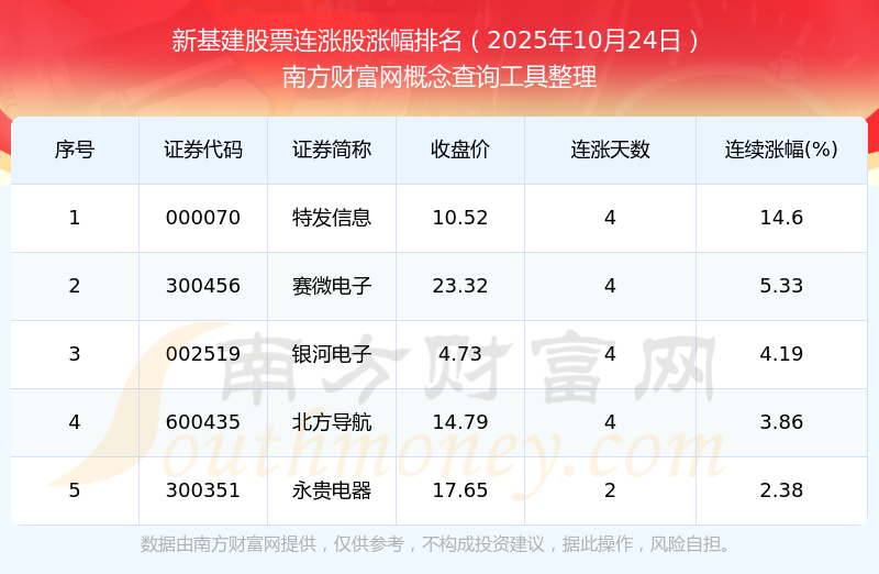 根據(jù)南方財(cái)富網(wǎng)概念查詢(xún)工具數(shù)據(jù)統(tǒng)計(jì),截止2025年10月24日收盤(pán),新基建股票共有5只個(gè)股實(shí)現(xiàn)連漲。其中連續(xù)漲幅較大的個(gè)股有特發(fā)信息、賽微電子、銀河電子等,連續(xù)漲幅分別為14.60%、5.33%、4.19%。