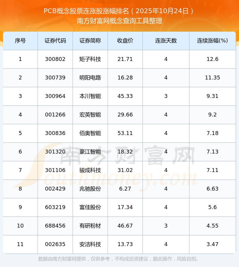 根據(jù)南方財(cái)富網(wǎng)概念查詢工具數(shù)據(jù)統(tǒng)計(jì),截止2025年10月24日收盤,PCB概念股票共有11只個(gè)股實(shí)現(xiàn)連漲。其中連續(xù)漲幅較大的個(gè)股有矩子科技、明陽電路、本川智能等,連續(xù)漲幅分別為12.60%、11.35%、9.31%。