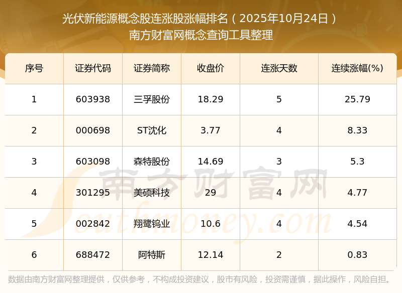 根據(jù)南方財(cái)富網(wǎng)概念查詢工具數(shù)據(jù)統(tǒng)計(jì),截止2025年10月24日收盤,光伏新能源概念股共有6只個股實(shí)現(xiàn)連漲。其中連續(xù)漲幅較大的個股有三孚股份、ST沈化、森特股份等,連續(xù)漲幅分別為25.79%、8.33%、5.30%。