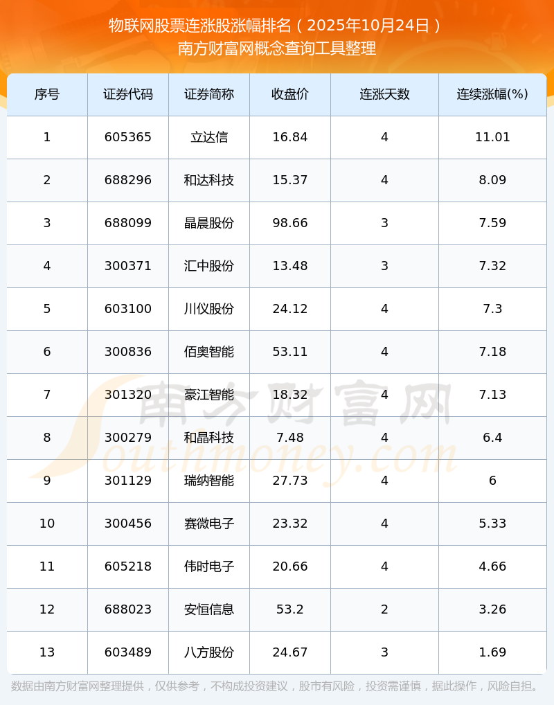 2025年10月24日物聯(lián)網(wǎng)股票連漲股漲幅排名
