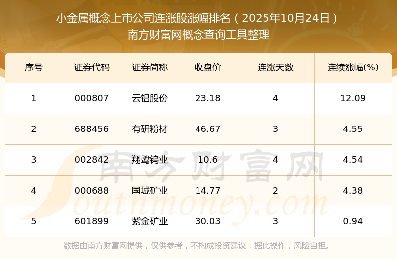 2025年10月24日小金屬概念上市公司連漲股漲幅排名