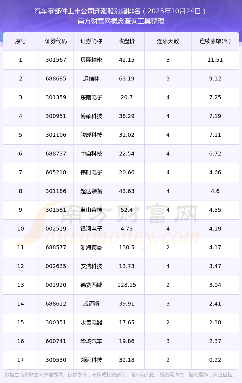 2025年10月24日汽車零部件上市公司連漲股漲幅排名