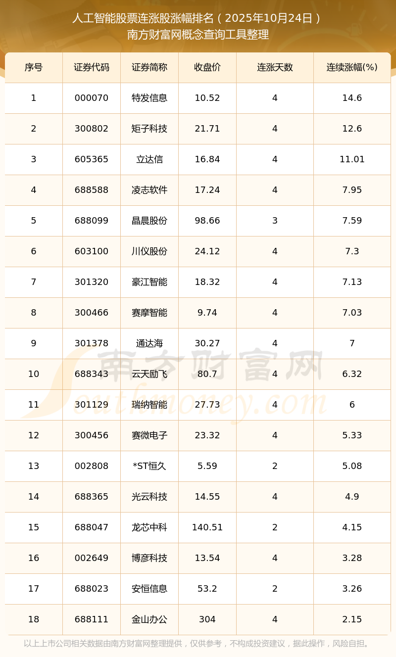 根據(jù)南方財富網(wǎng)概念查詢工具數(shù)據(jù)統(tǒng)計,截止2025年10月24日收盤,人工智能股票共有18只個股實現(xiàn)連漲。其中連續(xù)漲幅較大的個股有特發(fā)信息、矩子科技、立達信等,連續(xù)漲幅分別為14.60%、12.60%、11.01%。