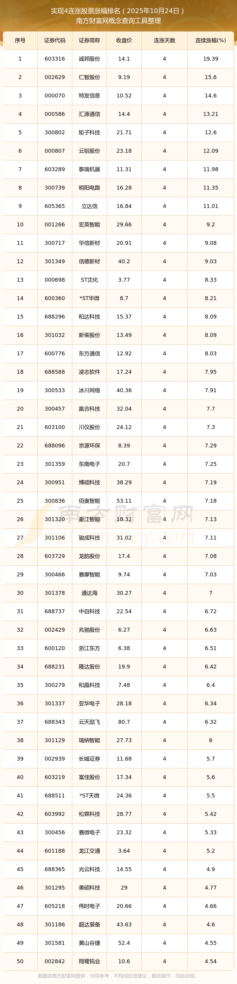 2025年10月24日實(shí)現(xiàn)4連漲股票漲幅排名