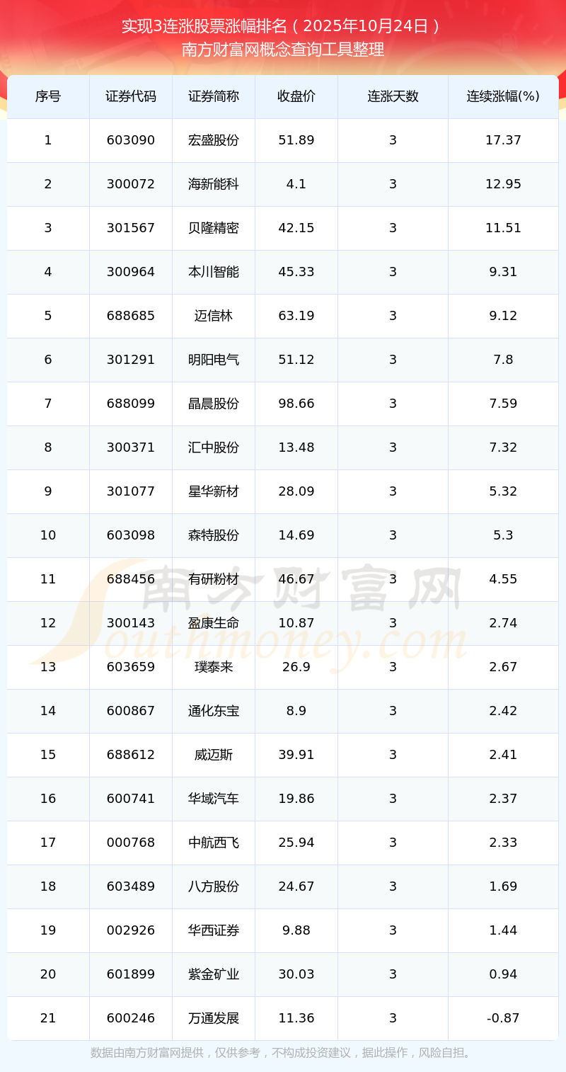 2025年10月24日實(shí)現(xiàn)3連漲股票漲幅排名